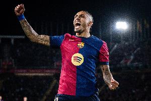 体育资讯5月1日讯 欧冠半决赛首回合对阵国米,巴萨攻击手拉菲尼亚破门。
